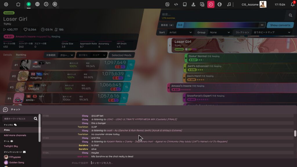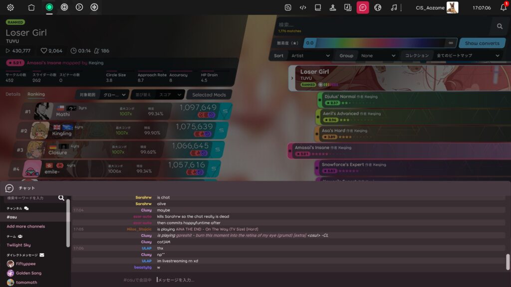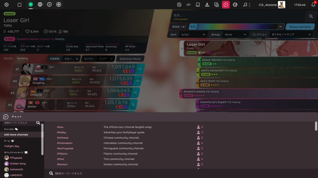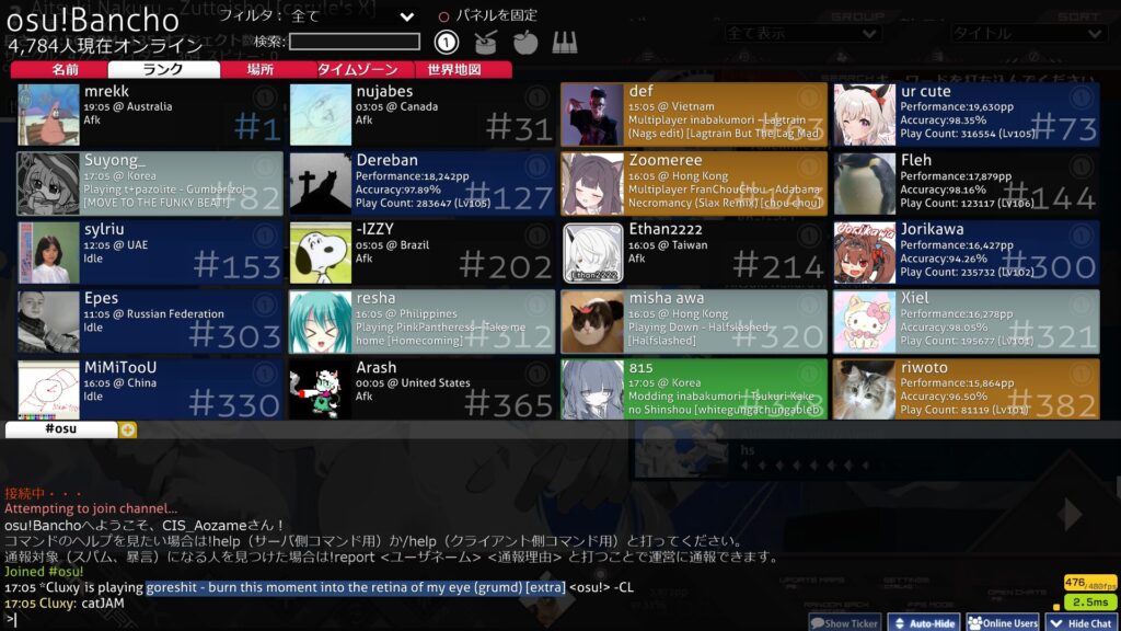 チャットを使えるようになると、osu!は「一人で黙々と遊ぶゲーム」から、世界中のプレイヤーとつながるオンラインゲームへと姿を変えます。