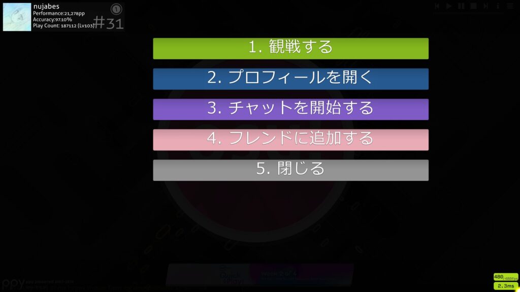 これは単なる情報表示ではなく、交流・観戦・マルチへの導線を一気にまとめた操作メニューです。使いこなせるようになると、osu!のオンライン体験が格段に快適になります。