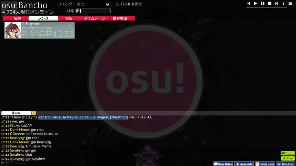 マルチプレイの募集、フレンドとの会話、BanchoBotとのやり取りなど、オンライン要素の中心とも言える存在なので、まずはここをしっかり理解しておきましょう。