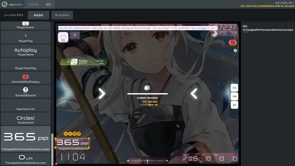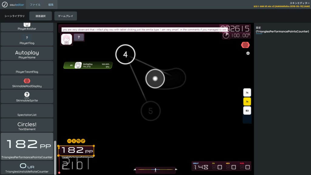 osu!lazer のレイアウトエディターを使えば、PPカウンター(Live PP / Performance Points)や精度表示(Accuracy)を好きな場所に自由自在に配置できます。