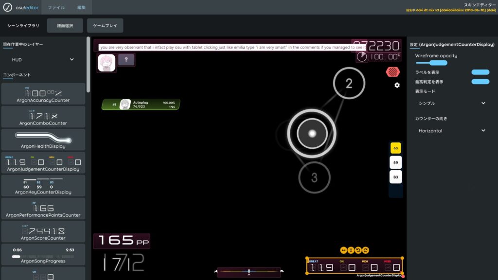 スコア表示、精度表示、HPバー、コンボ数、進行度バーなど、ほぼすべてのHUDパーツがドラッグ&ドロップで配置可能です。