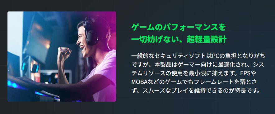 一般的なアンチウイルスは、バックグラウンドで常にスキャンを行ったり、ウイルス定義ファイルの読み込みに CPU・メモリを使うため、「急に FPS が落ちる」「操作がカクつく」といった問題を引き起こしがちです。