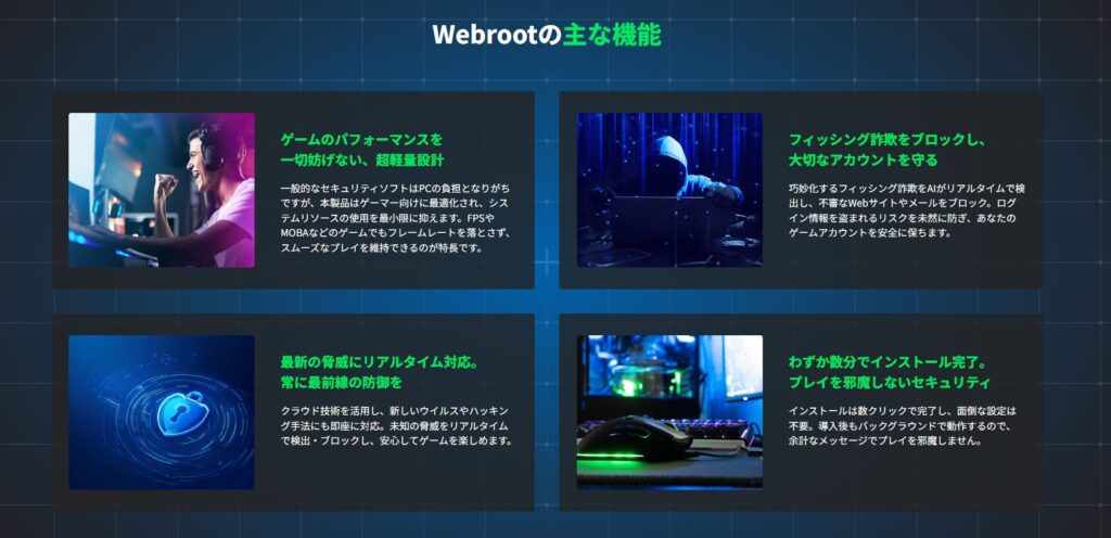 ここでは、ゲーマーはもちろん、一般ユーザー・ビジネスユーザーにも役立つ Webroot の主要機能・特徴 を詳しくまとめます。